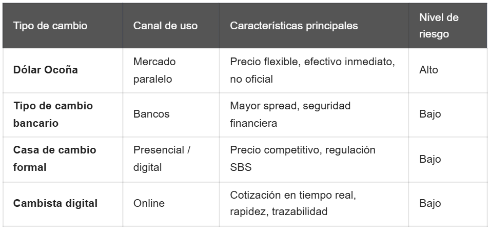 No obstante, el tipo de cambio Ocoña sigue reflejando movimientos del mercado paralelo, especialmente cuando existe mayor demanda de dólares en efectivo o eventos que presionan al tipo de cambio.